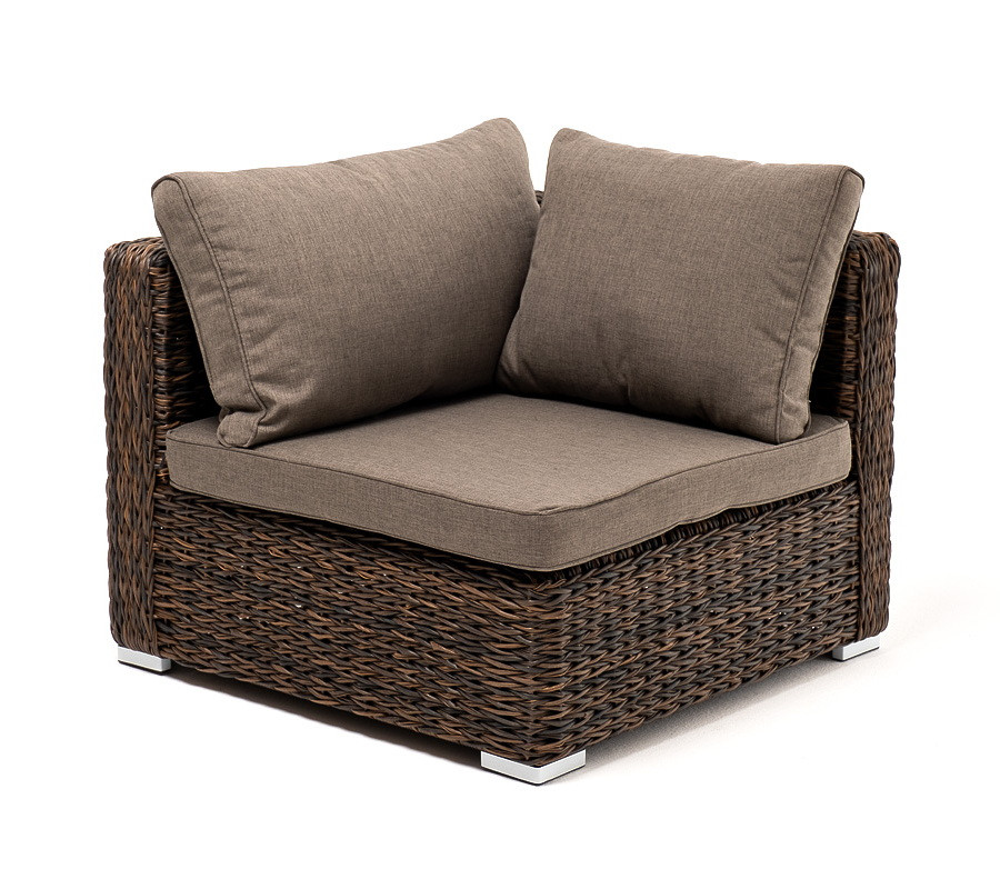 «Лунго» угловой модуль из искусственного ротанга вида "гиацинт", вляется неотъемлемой частью лаунж-зоны. В своем основании имеет каркас из алюминия, который вручную оплетен ротангом коричневого цвета.